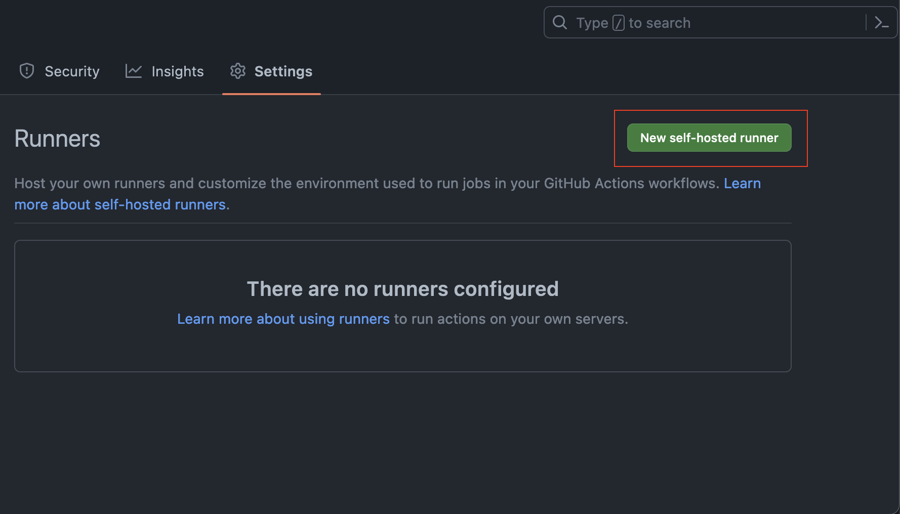New self-hosted runnerbutton to bring up the runner installation instructions.