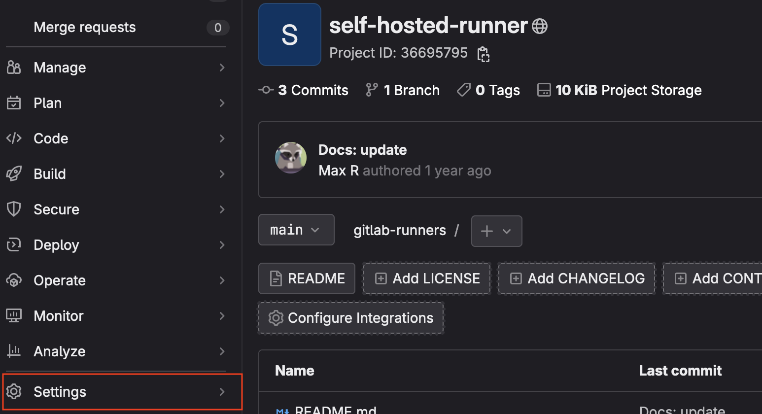 sudo gitlab-runner startLog in to Gitlab and navigate to the repo you want to create a runner for